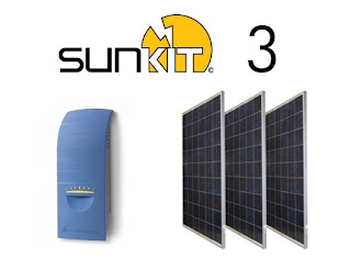 We zijn klein begonnen met een complete kit (panelen, bevestigingsmaterialen, omvormer en kabels) gebaseerd op drie zonnepanelenpanelen, opgeteld 690 Wp (Watt-Piek). Met Watt-Piek wordt bedoeld dat dit vermogen door de panelen geleverd kan worden onder gestandaardiseerde (ideale) omstandigheden. In de praktijk is het bijna altijd minder, tenzij de zon vol en recht op de panelen schijnt. De panelen leveren gelijkstroom en da's niet zomaar bruikbaar in de meeste huisinstallaties. Vandaar een omvormer (het blauwe kastje), deze zet de gelijkstroom om in wisselstroom met de juiste eigenschappen.